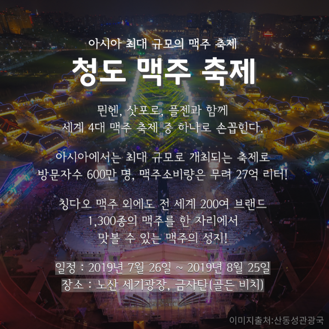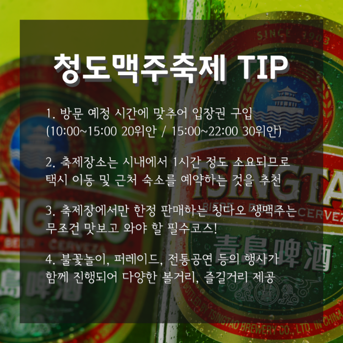 '청도국제맥주제'는 여행 황금기인 8월 둘째주에 개막되어 16일 동안 진행된다. 1903년 중국 최초의 맥주가 탄생한 청도 맥주의 명성과 지방 관광 활성화를 위해 1991년부터 시작되어 매년 열리고 있다. 청도는 독일의 식민지로 오랜 세월동안 있었기에 맥주 가공기법이 뛰어나 지역 특산물로 개발하게 된 것이다. 축제기간동안 청도는 매년 30개의 맥주 회사와 50만 명의 사람들이 이 축제에 참가한다.
